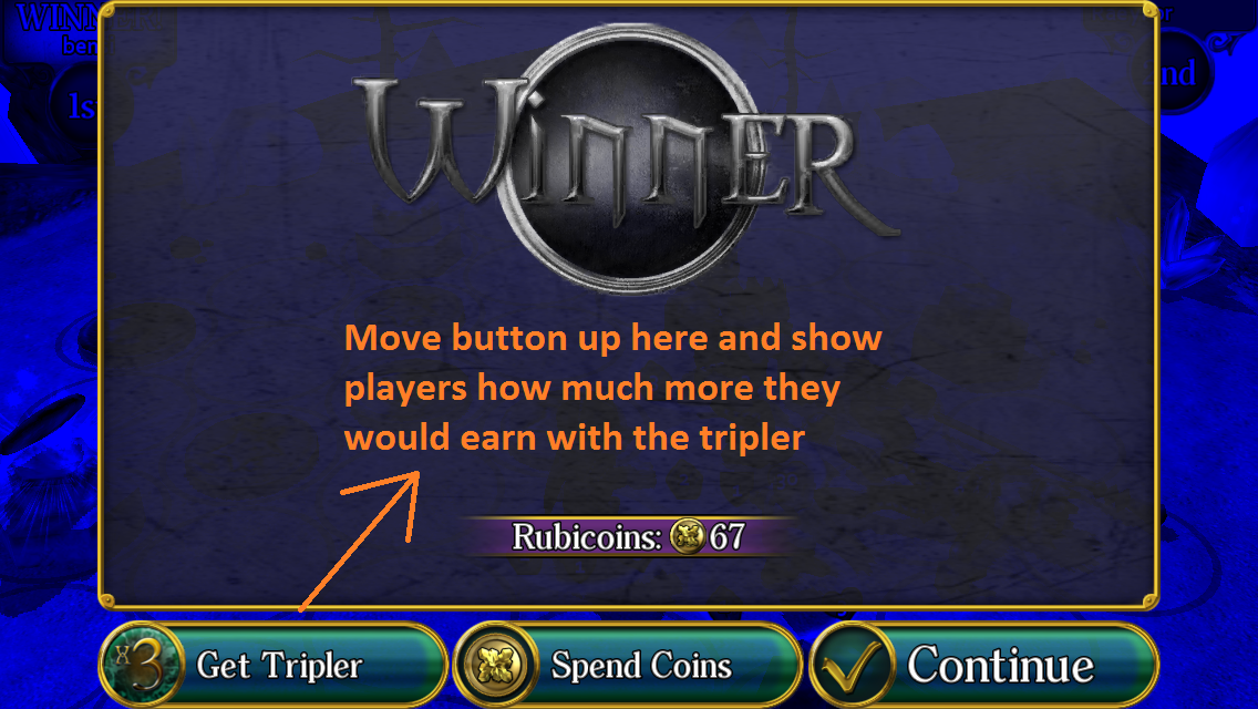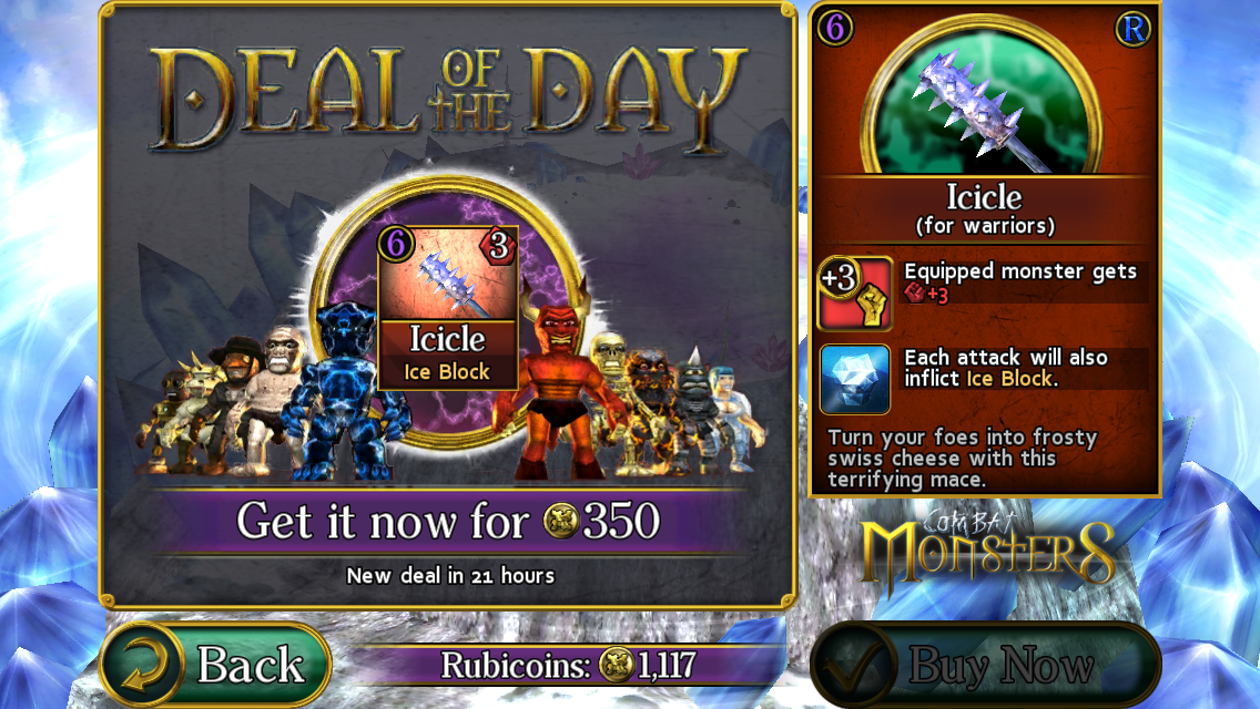 Combat Monsters has a few really interesting options built in the game, but the game doesn’t call enough attention to them. The first one is the Coin Tripler. This is a permanent enhancement that triples the amount of currency earned in battles. If you’re a fan of the game this should be your first purchase as it holds the most value (assuming you’ll be playing the game for a longer period of time). At the battle results screen they just list the tripler in the lower left corner. A cost effective way if gaining attention is adding a shimmer or animation to the coin tripler button.